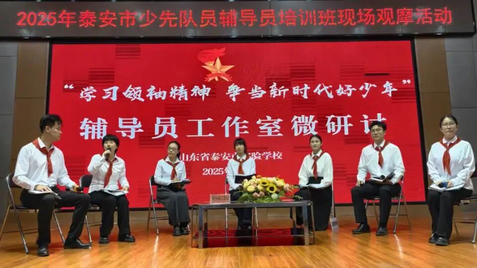 在泰安市实验学校,少先队辅导员们跟随红领巾讲解员的步伐,聆听了学校少先队工作介绍,实地参观了学校红领巾学院——泰山文化馆、足球文化管和红领巾文化长廊等特色阵地,并观摩了星光辅导员工作室的微研讨与红领巾剧场的情景剧表演。学校大队辅导员系统介绍了“童年有座山·红领巾寻访”少先队品牌活动课程的实践经验,有效助力少先队辅导员们在实践育人与文化育人工作中提质创新。